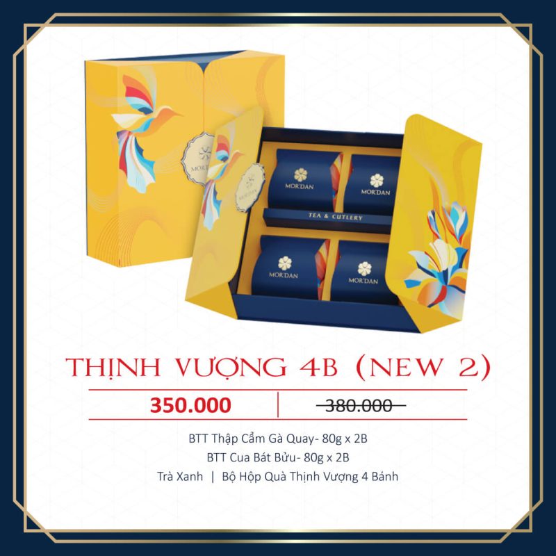 Hộp bánh trung thu Thịnh Vượng 4B mang hơi thở của mùa trăng qua sự kết hợp hài hòa giữa hương vị tinh tuyển và thiết kế sang trọng. Không chỉ đơn thuần là quà tặng Trung Thu, Thịnh Vượng 4B còn là lời chúc phú quý, an khang và hạnh phúc, được gửi gắm khéo léo trong từng chi tiết để người nhận cảm nhận trọn vẹn sự trân trọng và tinh tế.